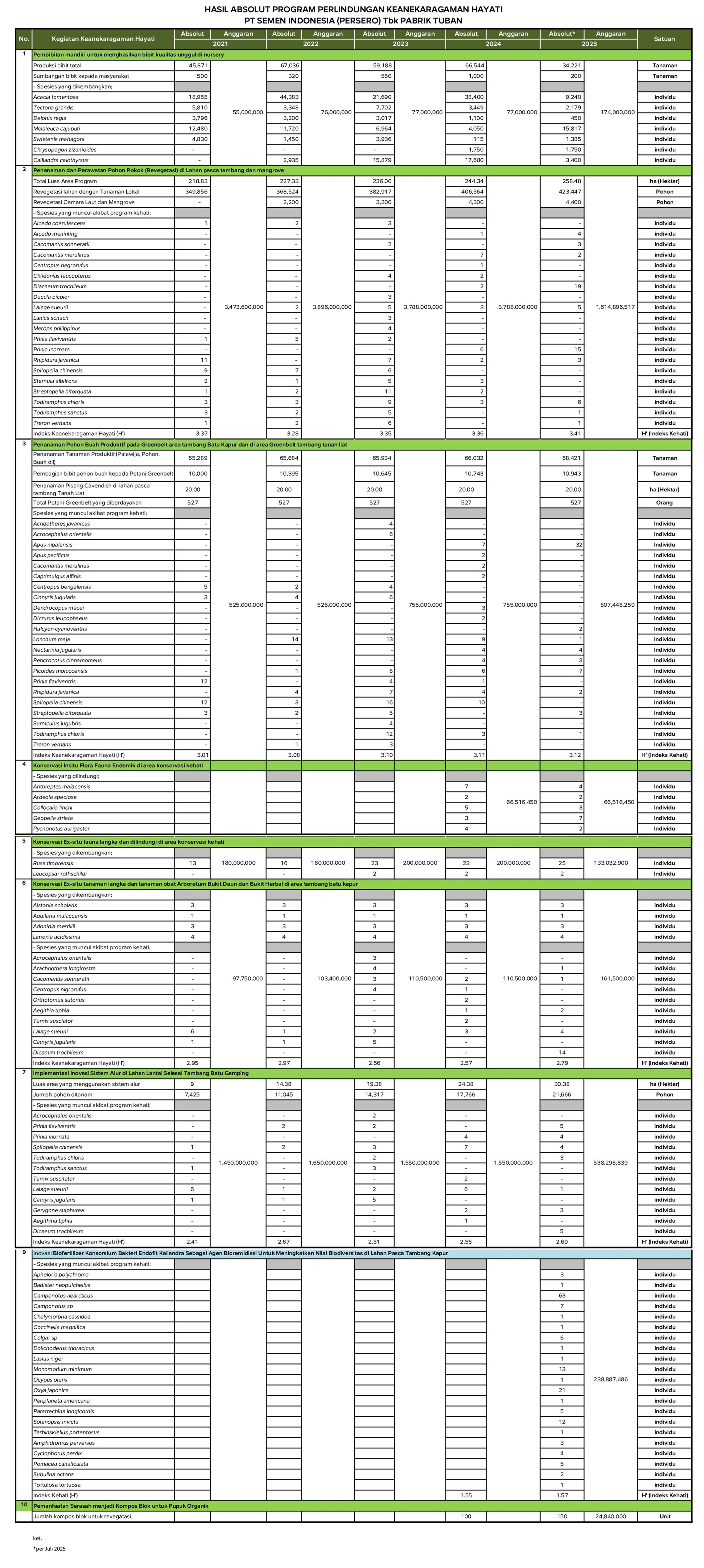 Mengacu pada Peraturan Menteri Negara Lingkungan Hidup Nomor 06 Tahun 2013, yang menjelaskan bahwa perlindungan atau konservasi keanekaragaman hayati merupakan salah satu aspek penilaian dalam PROPER (Program Penilaian Peringkat Kinerja Perusahaan dalam Pengelolaan Lingkungan Hidup). Oleh karena itu PT Semen Indonesia (Persero) Tbk rik Tuban telah berinisiatif sekaligus melakukan upaya identifikasi dan pemetaan kondisi keanekaragaman hayati atau biodiversitas yang telah dilaksanakan sejak tahun 2015 hingga saat ini berdasarkan parameter biologi. Perusahaan juga melakukan kegiatan pemantauan kondisi lingkungan yang kontinu (monitoring) sehingga dapat diketahui apakah terjadi perubahan-perubahan komponen lingkungan, khususnya biodiversitas yang mungkin dapat menimbulkan dampak negatif penting terhadap lingkungan sebagai habitat bagi biota.